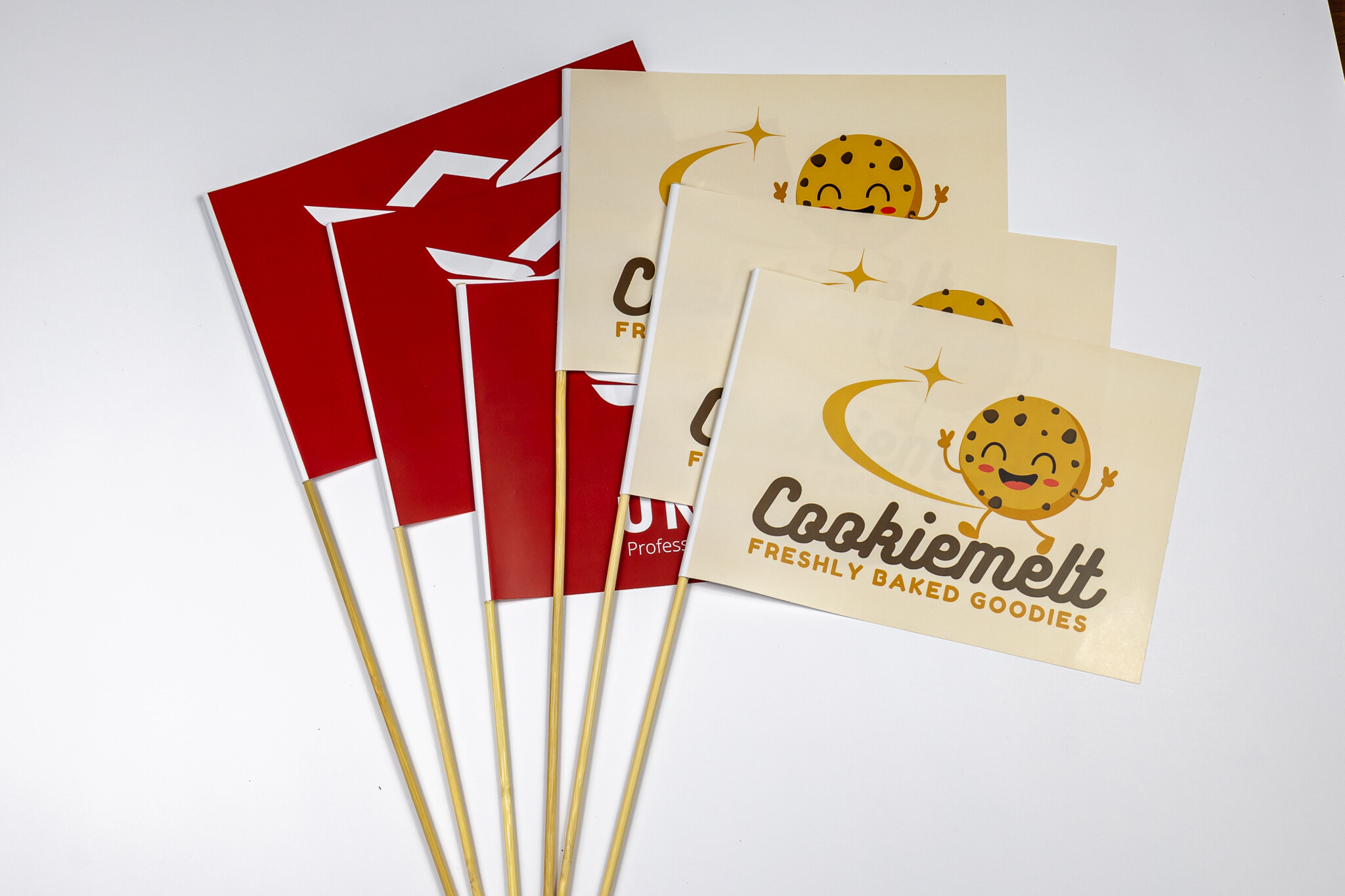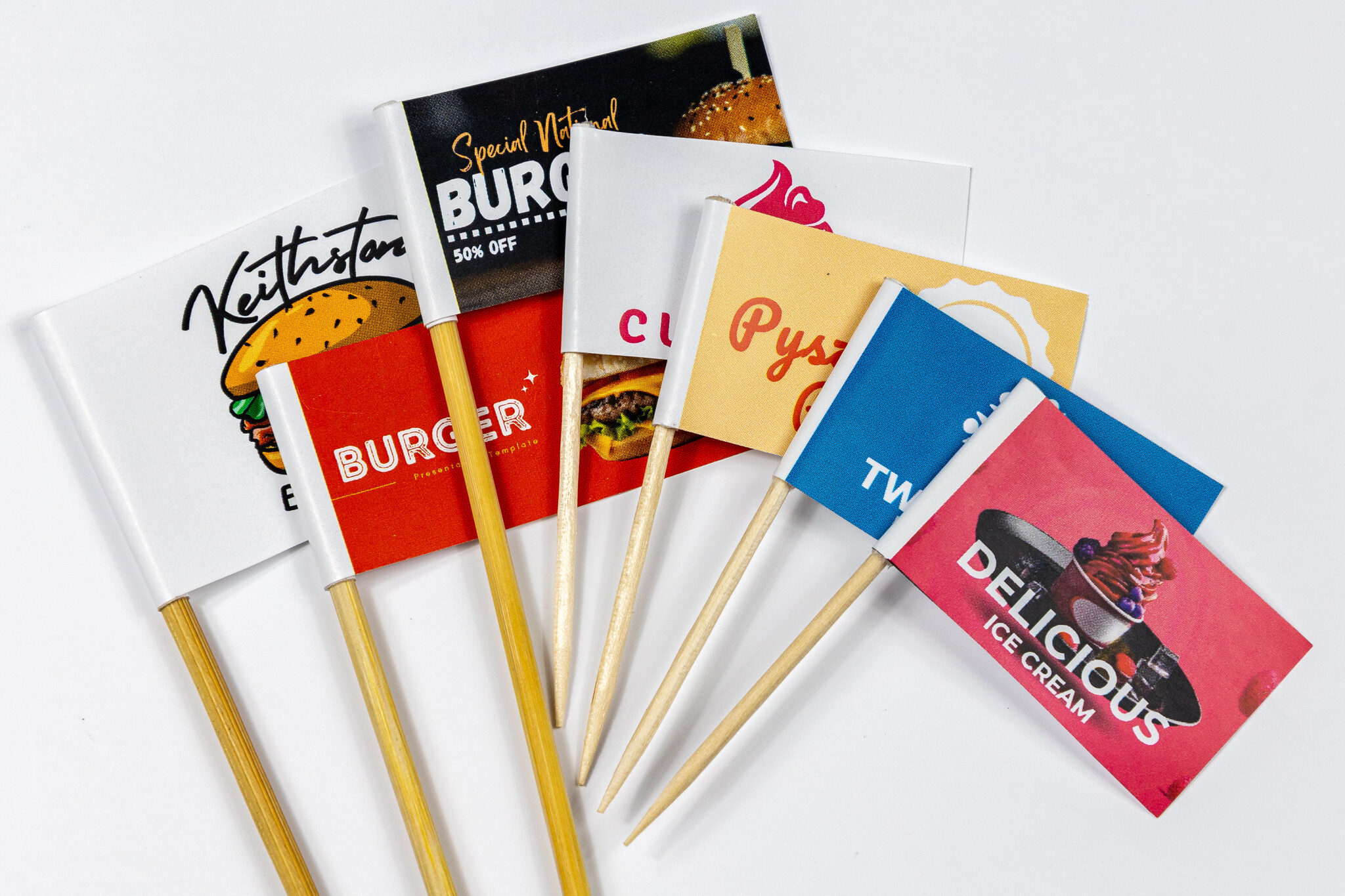 Mini chorągiewki na wykałaczkach – wymiary ok. 25x50mm – idealne do degustacji produktów, i serwowania przekąsek na eventach.